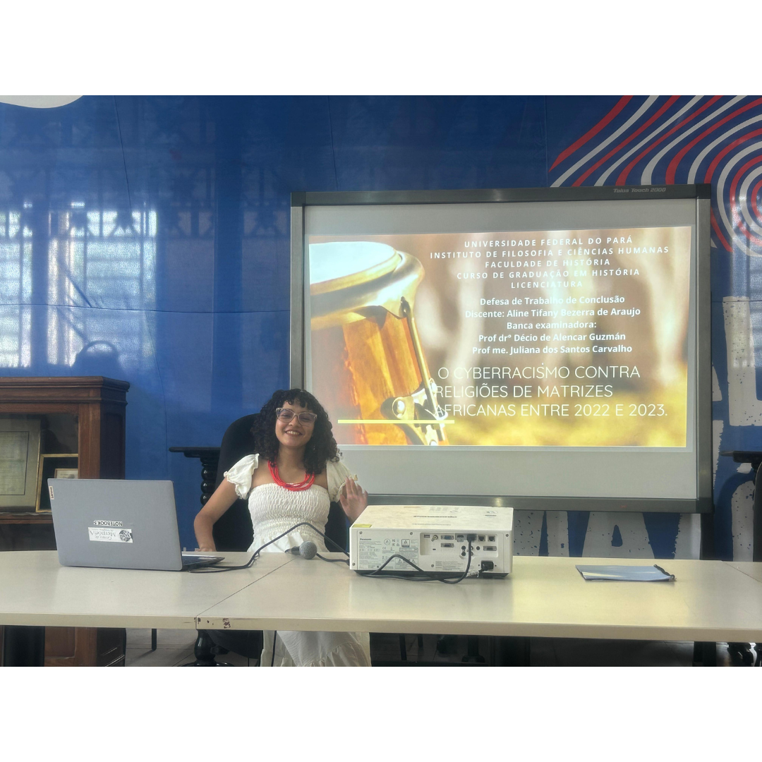 No dia 17 de setembro de 2025, tivemos no salão de eventos do Centro de Memória da Amazônia a defesa de Trabalho de Conclusão de Curso de Aline Tifany Bezerra de Araujo, intitulado “O cyberracismo contra religiões de matrizes africanas entre 2022 e 2023”. A discente de Licenciatura em História pela UFPA foi orientada pelo Prof. Dr. Decio Guzmán, e teve como examinadora a Profª. Mª. Juliana dos Santos Carvalho. Aprovada com Excelente, parabenizamos a Aline por essa grande conquista!